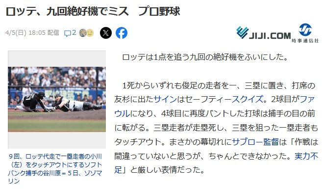 時事通信「ロッテ、九回絶好機でミス プロ野球」